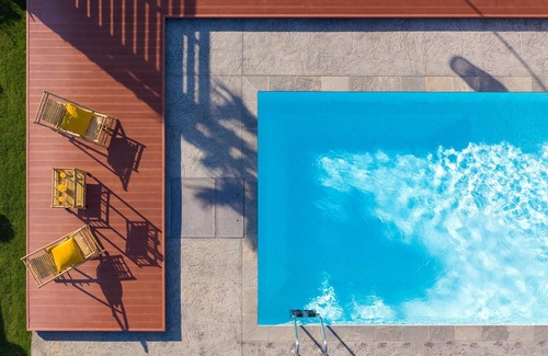 On the upper level, Maistros villa, offers 2 spacious double bedded rooms. Two bedrooms owns an en-suite bathroom with a stylish shower and a chic furnished balcony with a remarkable view to the sea. On the ground floor there’s a fully equipped kitchen and a spacious open plan dining / living area which has a comfy double sofa- bed one extra bathroom with a shower and one bedroom with double bed as well as a bathroom with a shower. Guests will also find a flat screen with satellite channels. The cozy living room opens to an inspiring furnished veranda with direct access to the architectural statement of the villa, the swimming pool along with the BBQ facilities. The private pool area in warm colors has stylish sunbeds with comfortable cushions and parasols encircled by lush lawns and a well-tended garden. There, you can work on your tan and enjoy the unique Greek summer weather. Pounentis Villa is situated next to Maistros Villa. These two identical villas ensure complete privacy for guests, each featuring its own private pool and amenities.