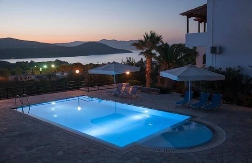 Following the charming and picturesque coastal road from Agios Nikolaos (11 km) parallel to the Mediterranean Sea, passing inviting coves alternating with breathtaking views to small islands and delightful sandy beaches you reach the village of Kalo Chorio and its coastal quarter "Istron". Our house is nestled into an enchanting countryside that invites to extended walks or hiking through the landscape of the rising hills and mountains which are covered mostly with cedar trees. The house was built in the midst of a large property (4.500 m²), quietly located on the side of a hill. The terraced garden, planted with colorful flowers, decorative shrubbery and different fruit trees (Mandarin-, Orange-, Apricot-, Lemon-, Olive- and Banana trees) extends harmoniously into the rocky backdrop of the hill, enhancing the majestic feeling of the house. On an area of 500 m² a swimming pool, including a wading pool for children, was added. Magnificent views and the alluring countryside surprise you over and over and draw you under their spell. Guests on this property are spoiled by unique panoramic views to the countless coves of the Mirabello Bay all the way to Agios Nikolaos. Every apartment has a Safe, W-Lan and an air conditioning unit. Balconies and Patios, all covered by pergolas, are equipped with table and chairs. The furnishings in the house are made of solid wood, bathrooms and kitchen are tiled and all the floors are laid out with white marble. Every apartment includes a TV-set. In the garden you also find a grill area next to a stone built, traditional Greek oven in which bread can be baked as well as other typically Greek food. The adjoining marble table and benches invite you to rest and to enjoy the just prepared food under the shading trees caressed by the fragrant air. Another delight is the splendid view from up here to the Mediterranean Sea that will stay in your memory for a long time. Children can play freely on this enclosed property and romp the garden to their hearts content (a sandbox is also available for their use). Various large and small coves alternate with each other and offer either pebbled or sandy beaches. About 650 m from the house you reach the first beach - half of it is sandy, the other half with pebbles. Everyday you have the opportunity to venture out and discover something new. Because of its location a good starting point to visit Minoan palaces, remote monasteries, Byzantine churches, caves, grottos and many enchanting natural sights. Villa Michalis 3 for 4-5 Pers. This is an attached two-story house. Located on the ground floor is the living room whose extension includes the kitchen. This spacious area is in addition to other furnishings also supplied with a TV and a large Cretan sofa (sleeping for the 5th person). From two sides of the house you have access to the patios - one with view to the mountains, the other with view towards the Mediterranean. The bathroom is also to be found on this level. A staircase leads from the living room to the upper floor of the house with 2 bedrooms (one with double bed, the other with 2 single beds). Both bedrooms extend to a large balcony with exhilarating views.Short description 1Number of kitchens : 1SurroundingNearby sports facilities : Canoeing, Diving, Fishing, Rowing, Sailing, Surfing, Water skiingRental Facilities : Bicycle rental service, car rentalGarden and outdoorGarden facilities : Garden furniture provided, Grill, PavilionOn-site leisure facilities : Outdoor swimming pool shared use, Swimming pool