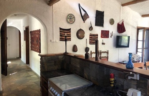 This is a beautiful older house on the west side of the island on an outcrop of land in the middle of Megali Amos bay. The main house is 2 bedrooms and sleeps 6. There is a separate private studio that sleeps three more people for an additional $175 a night.