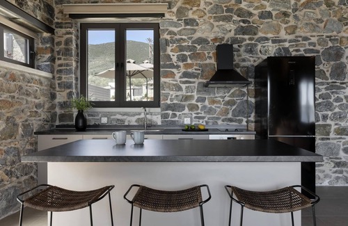 Lichnos Stoa has plenty of room (62 m2) to accommodate up to four guests. It combines the characteristic boho chic architecture with a modern interior that offers all the necessary amenities. It has two bedrooms with double beds and two luxury bathrooms. The prevailing white tones and traditional Pelion stonework are in perfect harmony with the earth colors and wood details on the elegant furniture and the decor. There is a comfortable living room and a fully equipped kitchen. The wonderful terraces, one overlooking the pool and the other, private, with a view to the river and the mountain, make Lichnos Stoa stand out as the ideal holiday retreat.