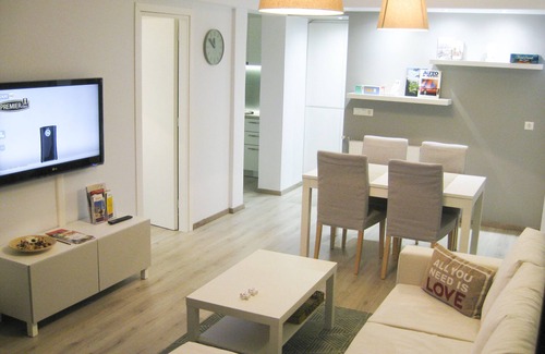 This 57 sq m apartment provides a fully equipped kitchen (fridge, oven, microwave oven, electric cooker, kettle, dishwasher, washing and dryer machine). There is a dining table for four persons, a 42 inch TV, Wi-Fi, relaxing sofa-bed, spacious wardrobe with hangers, 1,60m * 2,00m bed, heating, ventilation, 2 a/c. Led and spot lighting is available in living room, bedroom, kitchen, creating the perfect atmosphere. Two electric shutter mechanisms provide shading in addition to roller shade. There is a small garden outside the apartment.