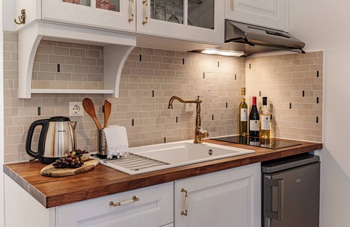 Luxurious Makris Gialos Suites, traditional zakynthian stone construction meets modern amenities inside, right by the beautiful Makris Gialos beach, wonderful clear sea, apartments are for rent from begin of April to end of October, 7 Suites available for rent in the villa (4 Classic downstairs and 3 Superior upstairs), even if our calendar shows booked please contact us anyway as we have a total of 7 apartments for you to choose, self catering, various restaurants can be reached on foot. Our own restaurant To Petrino is situated right next to the Suites. Beautiful sunny balcony with wooden furniture and umbrella/pergola, beautiful views of Makris Gialos and the Ionian sea, private parking, separate bedroom with double bed, private safe in for your valuables, elegant, high-quality bathroom with shower cabin (Classic Suite) or shower-tub in the Superior Suite (not for use of full bath - it is shower only), Italian wood vanity, WC, spacious living room with dining area and kitchen, two hot plates, full range of cooking utensils and cuttlery, filter coffee machine with filters, fridge, Sony flat screen TV, CD / DVD player, Astra satellite TV, free 24h WiFi access, free use of personal safe for your valuables, free air conditioning, hairdryer, dimmable lighting in the bedroom and living room (only in the Superior Suites upstairs)