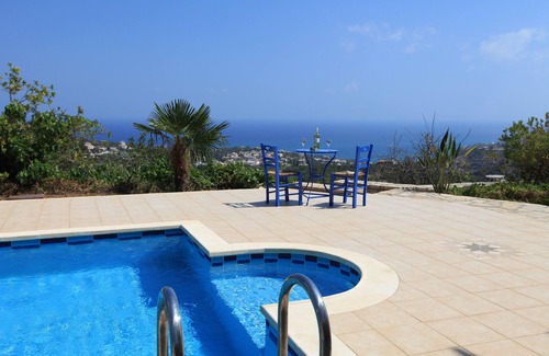 The garden is planted with native plants and palm trees. A neighbor is about 150 m away. The tiled pool measures approx. 8x4 m. There is a large tiled sunbathing terrace around the heated pool (in the colder seasons, if the weather permits). There are comfortable loungers and parasols at your disposal. There is also an outdoor shower in the pool area. Enjoy the fantastic Crete sunsets with a glass of wine here! The pool is a few meters in front of the bedroom. From here you also have an excellent view of the sea and Gerani.