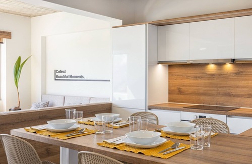The villa's kitchen is completely furnished and has appliances such an oven, dishwasher, fridge, toaster, coffee maker, and blender. Two large double bedrooms are available, each with a king-size bed, air conditioning, and a balcony. There is an ensuite bathroom in one of the rooms. Towels, slippers, hair dryers, and complementary toiletries are available in every bathroom.