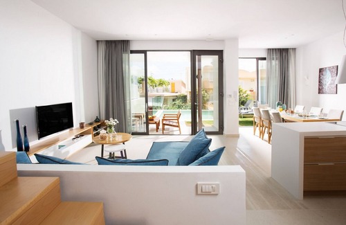Living room with a fully-equipped kitchen and dining area for 8 people. One bedroom with king-size bed and a common bathroom room.