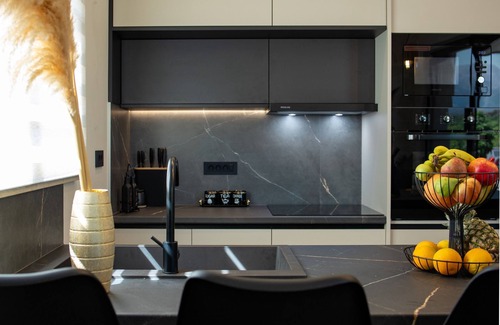 A fully equipped kitchen includes a stove, oven, microwave, fridge, dishwasher, espresso machine, kettle, toaster, and all cooking basics. You’ll also find wine glasses, BBQ tools, and a dining area for shared meals.