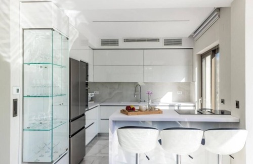 The spacious villa with a terrace and sea views has 4 bedrooms, a living room, a flat-screen TV, an equipped kitchen with a dishwasher and an oven, and 2 bathrooms with a walk-in shower. A private entrance leads guests into the villa, where they can enjoy some wine or champagne and fruits. The villa offers bed linen, towels and housekeeping service.