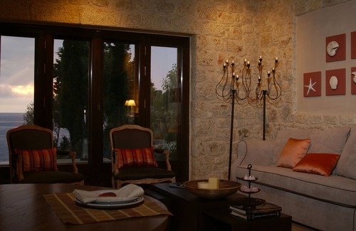 Pelagia Couple: This cottage has two terraces where you can soak up the sun and admire the scenery. The main terrace has access from the sitting room through double patio doors and faces the sea. A path leads down from here to the cliff edge. The other terrace faces out over the bay and has access by double patio doors from the sitting room and from the bedroom.