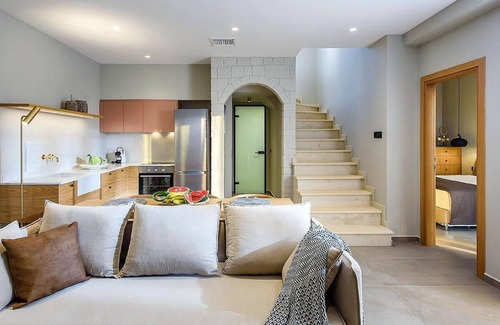 Each villa has three bedrooms, two on the floor with a shared bathroom and one bedroom on the ground floor with its own bathroom inside the room. At the same level there is the main space with lounge, fireplace, dining room and fully equipped kitchen that has access to the guests wc and a small warehouse. The villas feature a central cooling heating system, security systems, tv 42``, free wi fi. Access to the villas and the complex is done with unique code available at the time of booking. Villas are not suitable for people with reduced mobility.