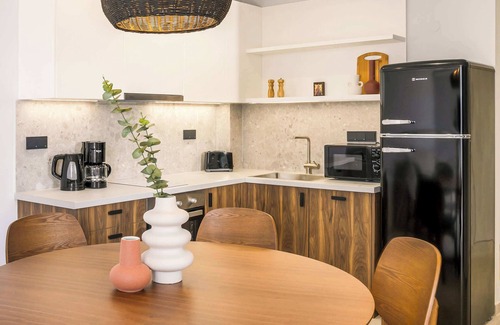The adjacent fully equipped kitchen invites culinary adventures, whether you're whipping up a delicious meal to enjoy al fresco by the pool or gathering around the dining table for a memorable feast with loved ones.