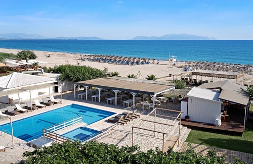 The accommodation has a private balcony and access to a shared outdoor area. The shared area includes a fenced pool, garden, children's pool, open terrace, and covered terrace. The property is located right on the beach and public transport is within walking distance.