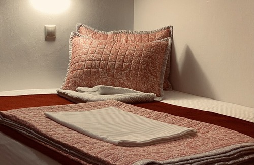 Welcome to our stylish studio on Skala Eresos Beach! Our studio is perfect for travelers seeking a comfortable and convenient getaway. The sleeping area features a unique glass brick wall that adds an elegant touch to the space. The double built-in bed and handmade wooden bunk bed offer comfortable accommodations for guests, ensuring a peaceful night's sleep after a fun day at the beach.