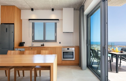 Entering on the ground floor of both Villas you are welcomed by a bright open plan space, featuring the living room and kitchen. The living area enjoys large openings directly to the pool terrace thanks to its large sliding doors, and offers wonderful sea views, as well as a comfy corner sofa. The fully equipped kitchen is complemented by beautifully crafted wooden furniture and an indoor dining area with a counter and bench, allowing you to prepare your homemade meals at ease and make the most out of your self-catered holiday.