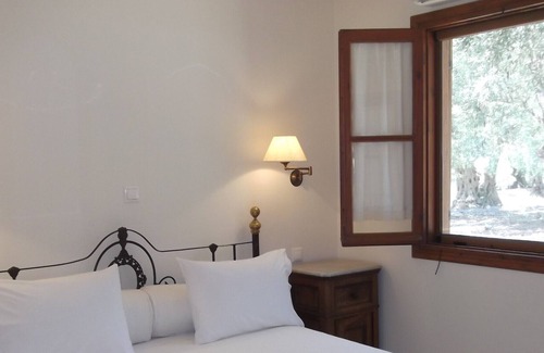 A traditional style architecture, stone constructed, totalling 110m2. It is a house consisting of 2 spacious bedrooms of 13m2 each and 2 bathrooms with shower in each one, kitchen with all facilities for cooking, and a living room with immediate access to the kitchen. In the living room exists a pull coach transformed in 2 seperate beds.The roof of the house is made of wood. The house is surrounded by 2 outside verandas with marble tables suitable for eating and having breakfast. Under the pine trees there is a monastery wooden table for eating.For children and there is a small tree house.The villa is built at the bank of one of the most beautiful bays of Lesbos and Greece,the gulf of Gera. It is situated amongst pine trees ,olive trees and original Lesbian vegetation.You can find origanon,rosmarie,basilikon,levantas,thyme, etc. Since the villa is built on a large olive groove of 8000m2, its secluded position, secures total privacy to the residents.The villa is situated 30 meters from our own private beach. There is also a taverna at 800meters from the villa situated by the sea, which provides excellent local food, fish, at reasonable prices.