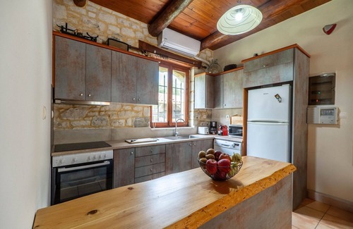 Inside, the villa is set over 2 floors. The interiors are fully air-conditioned (included in the rental price), and finished with taste and style making wide use of local stone and traditional Cretan elements. On the ground floor there is a large lounge with adjoining kitchen and dining area. The lounge is equipped with comfortable sofas (as well as a sofa bed for the 7th guest), TV, direct access to the veranda. The well equipped kitchen (4 cooking, fridge/freezer, oven, washing machine) opens straight to the lounge area where a dining table is located. On the ground floor there is also a spacious twin bedroom opening straight onto the garden. A family bathroom with shower is also located on this floor. On the upper floor there are 2 further airy bedrooms and a family bathroom with bathtub. The bedrooms are respectively a double and a twin and have access to a lovely furnished terrace providing relaxing views over the countryside.